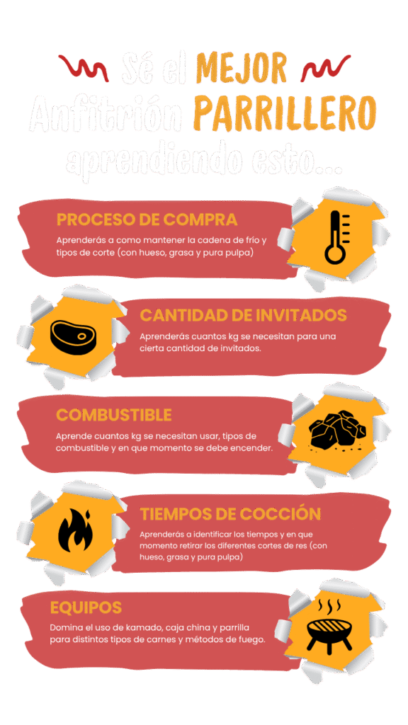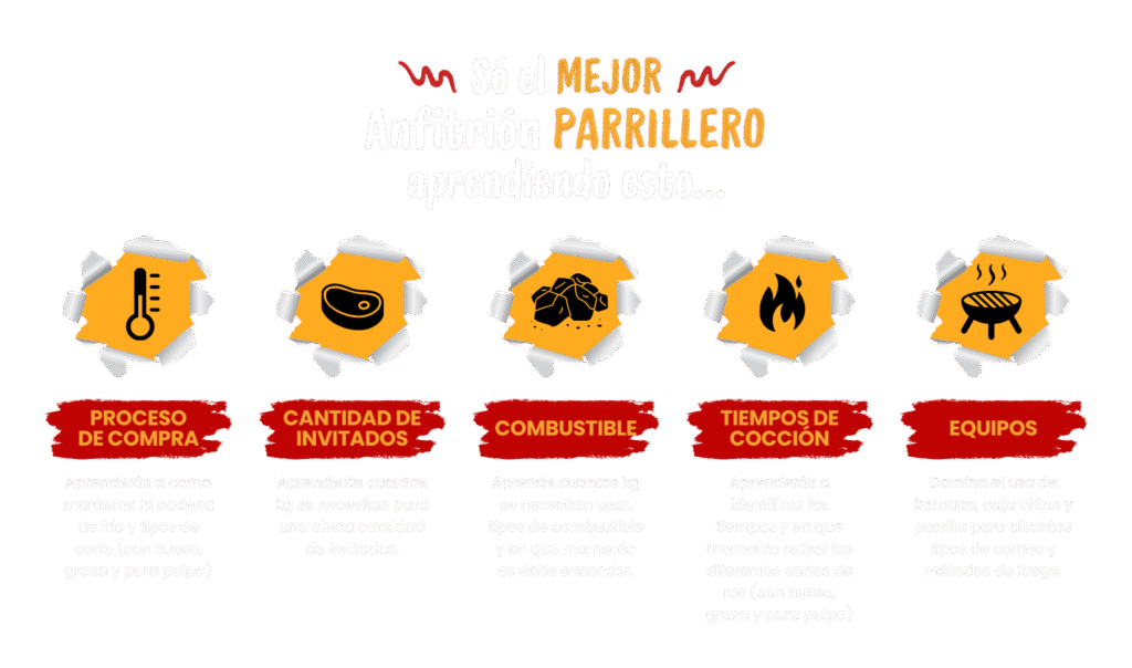 • Dominar la técnica de retirar, cortar y presentar un delicioso plato de carne a la parrilla.
