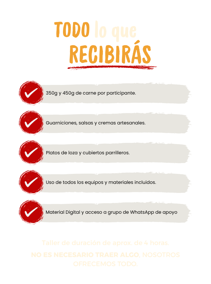 Tu participación en el taller se basa en tu interés por descubrir y aprender sobre los diversos cortes de carne de res, tanto locales como importados. En cada sesión, contaremos con una variedad aproximada de 10 a 13 kg de carne de res para que puedas sumergirte en la experiencia(aprox. de 350 a 400gr por participante). Algunos de los cortes que exploraremos incluyen: